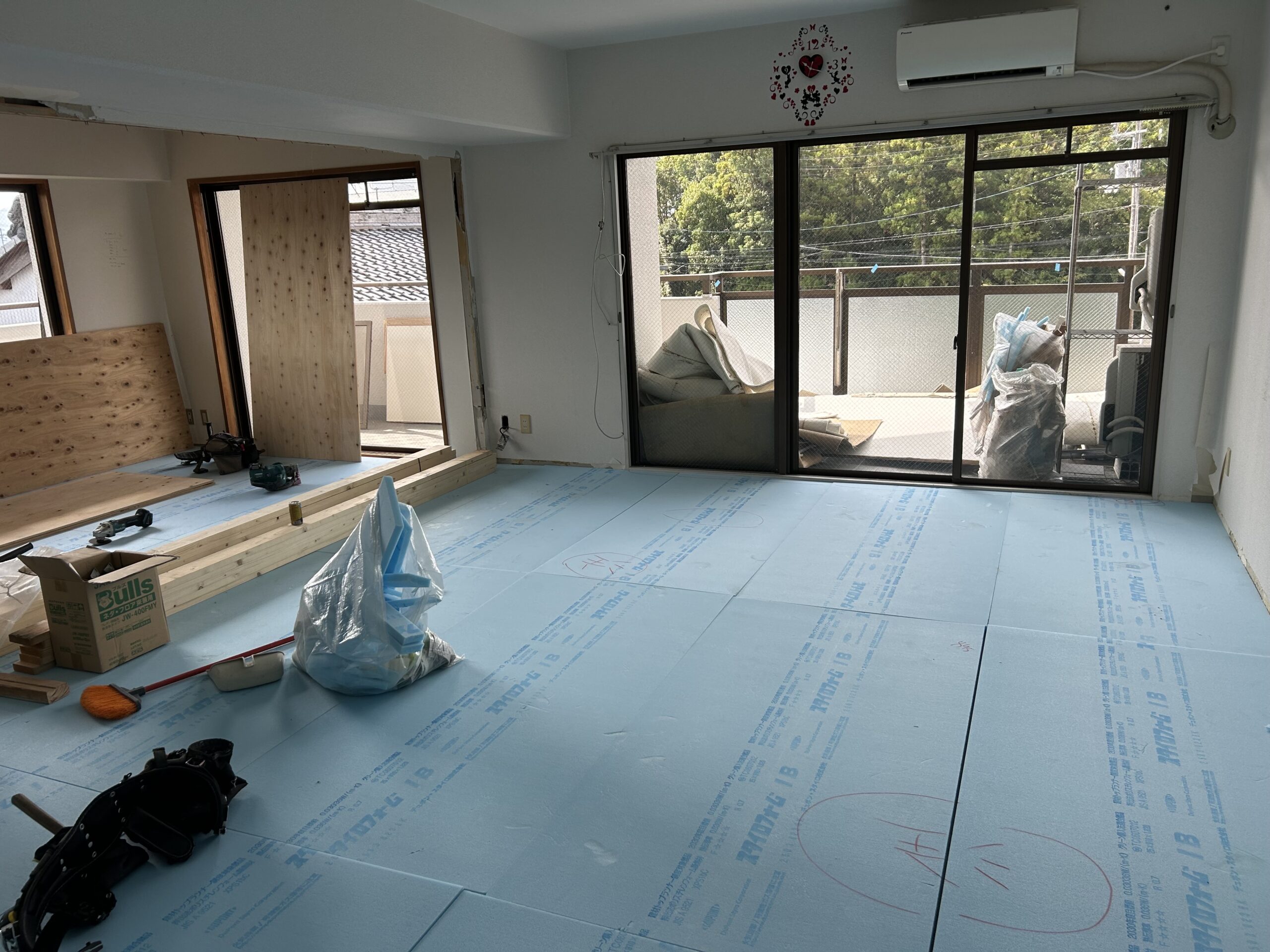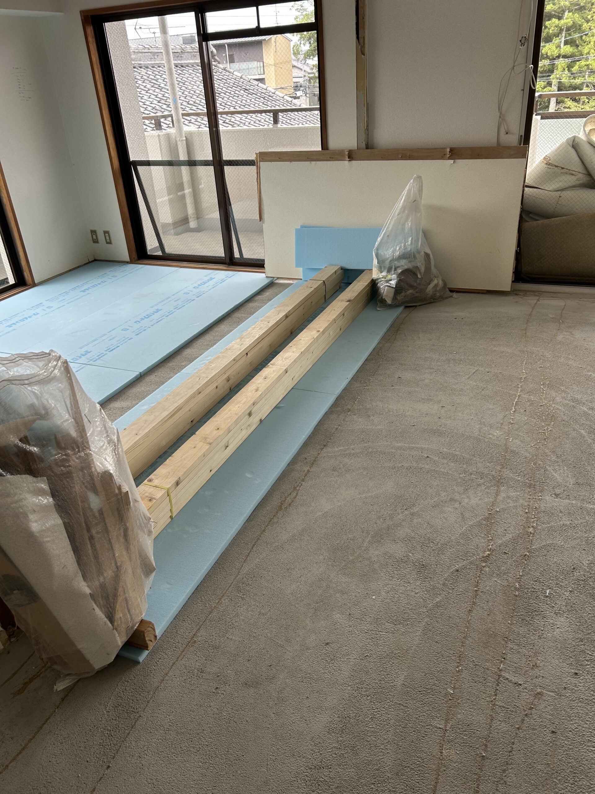 コンクリートの床にスタイロフォームを敷詰め、断熱効果を高めたリノベーション工事です。